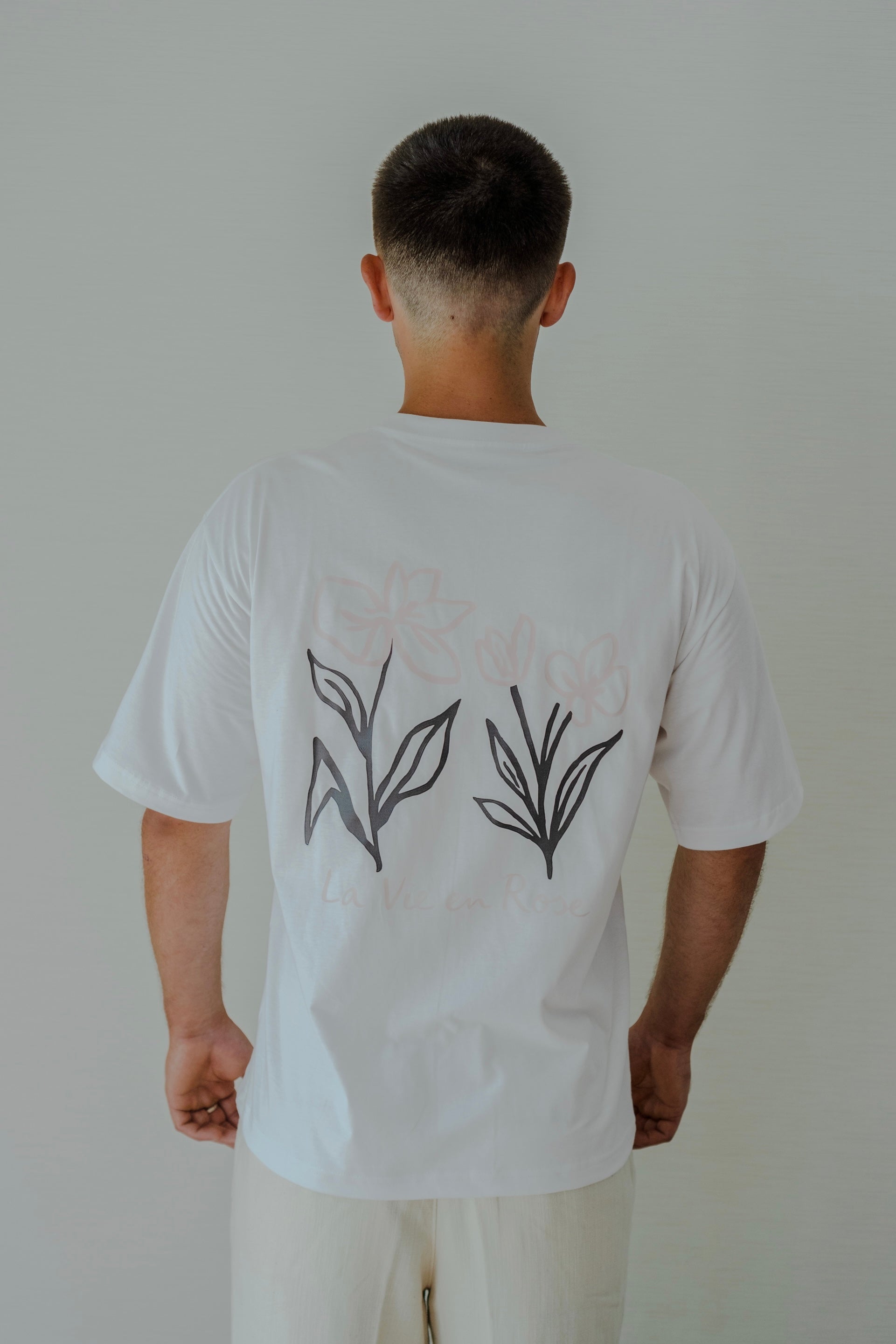 Ce T-shirt représente des fleurs noir et rose, avec l’inscription « La Vie en Rose ».
