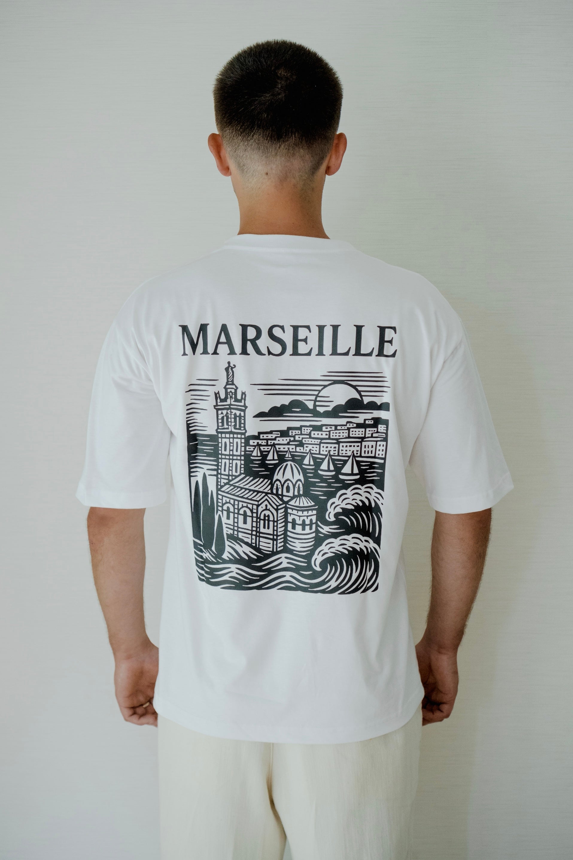 Ce T-shirt représente une illustration graphique noire représentant un paysage emblématique de Marseille.